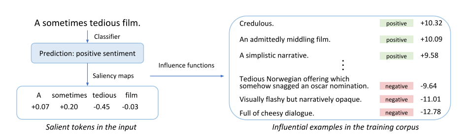 One approach is to identify which examples in the training set were most influential for predictions regarding particular test instances. For incorrect predictions, this could give us intuition on why the model is failing, and guide us to ways to fix it. Here is an example where it was possible to pinpoint why a model yielded incorrect sentiment prediction.