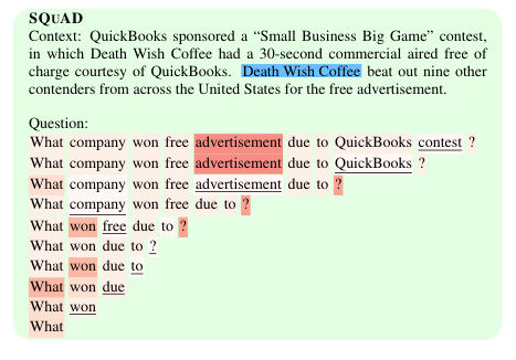 Another approach is to identify which parts of the test sentence itself were important to the eventual prediction. Imagine perturbing the test sentence in some ways, and studying how the prediction changed. In one study of a Question-Answering model, the question was modified by dropping the least important word, until the question was answered incorrectly. In this case, the study revealed something pathological about the model:
