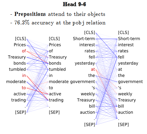 For transformers in particular, a great deal of study has focused on the weights that the attention layers pick up. By relating these to linguistic information, researchers try to infer the precise language-related information that models retain. For instance, it has been found that BERT learns parts of speech. It is also able to identify the dependencies between words.
