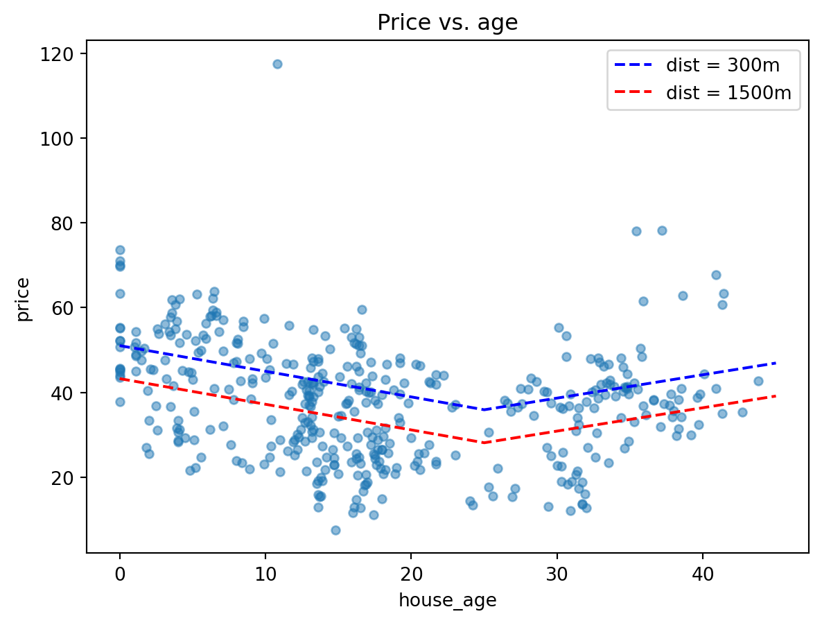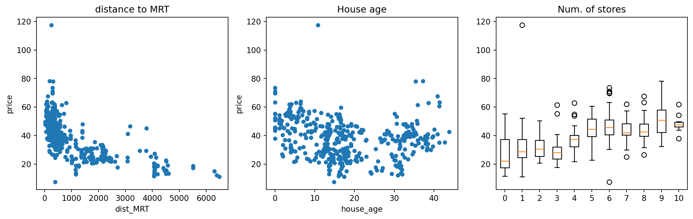 lm_age_mrt_3 = ols('price ~ house_age + x3 + num_stores + ldist', data=re2).fit()