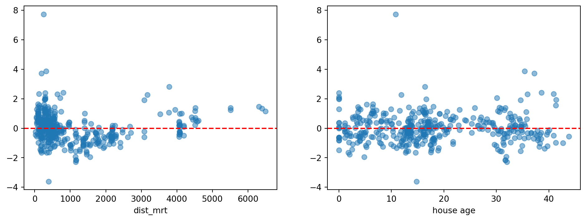 While the plot for house age looks acceptable (points are evenly scattered about the red dashed line), the one for distance shows some curvature. This is something we can try to fix, using a transformation of the x-variable.