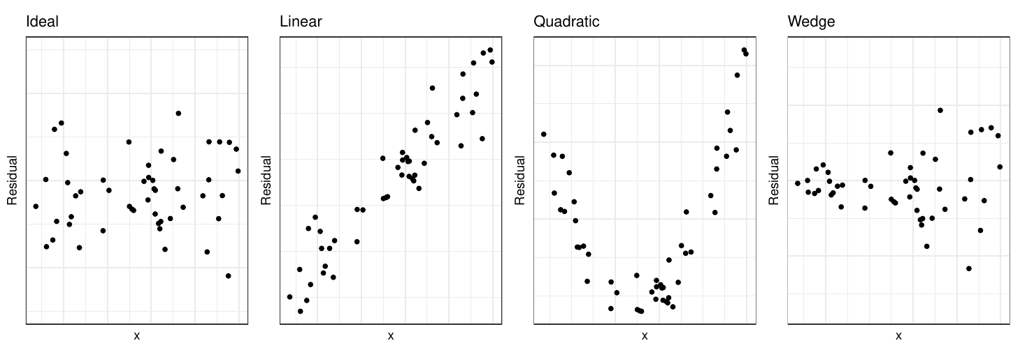 - The second plot is something rarely seen. It would probably appear if we were to plot residuals against a new variable that is not currently in the model. If we observe this plot, we should then include this variable in the model.