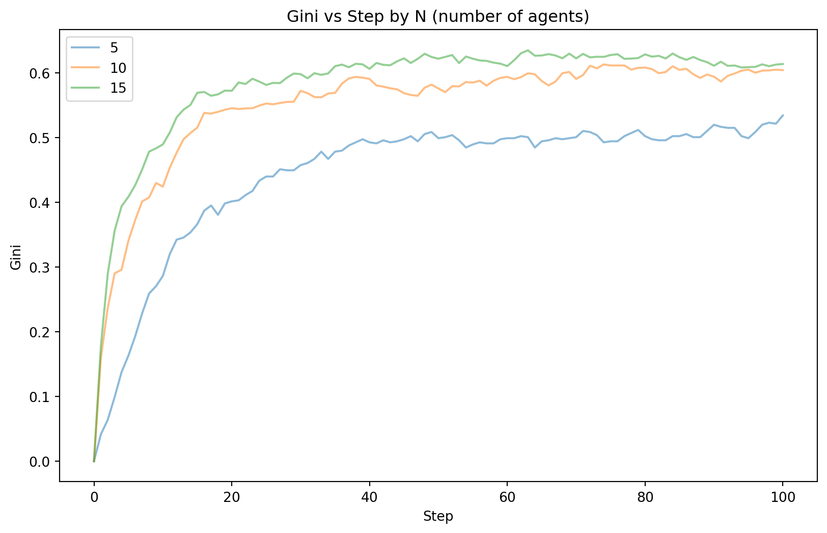 - Vary the number of agents, to understand the Gini coefficient after 100 steps.