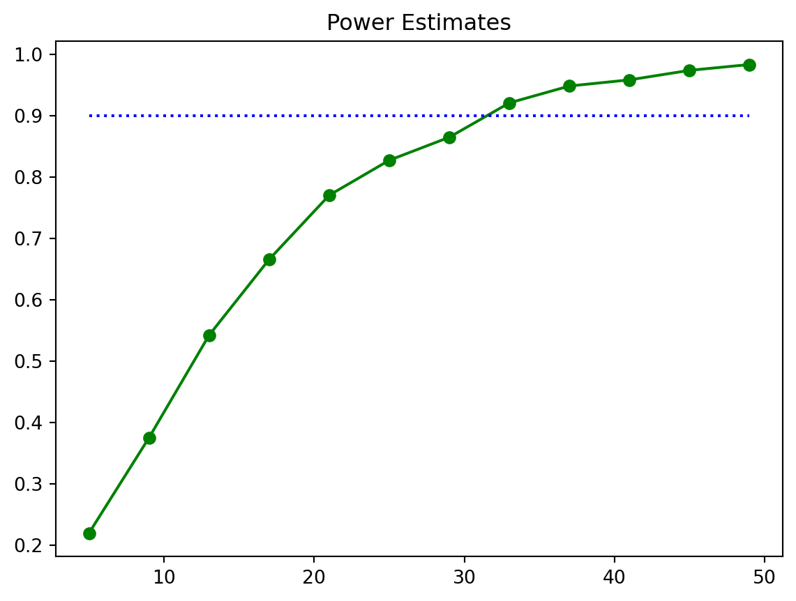 Now we run multiple iterations of that function and plot a graph depicting how the rejection probability varies with the sample size.