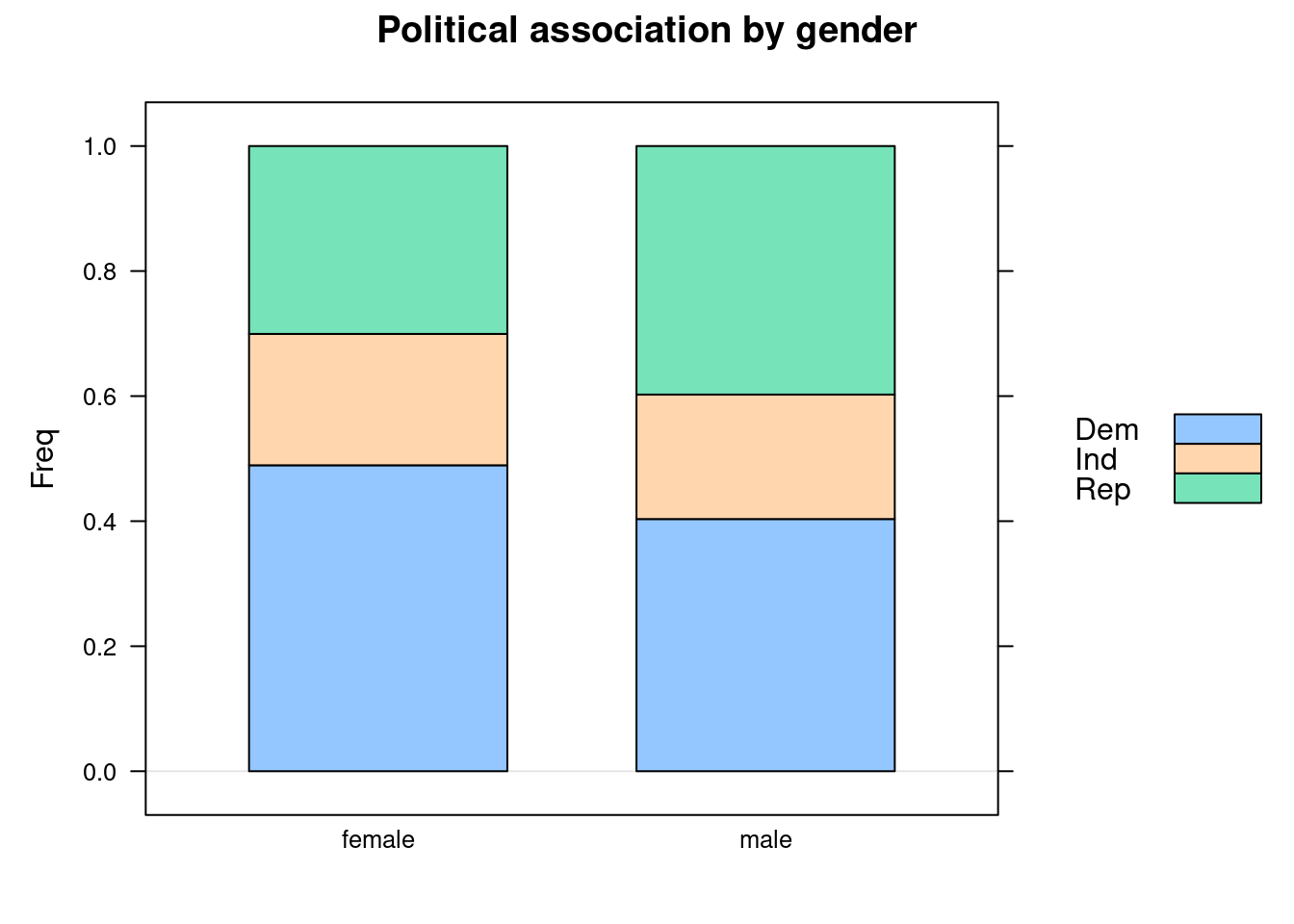 We can see that the proportion of Republicans is higher for males than for females. The corresponding proportion of Democrats is lower. However, note that the barchart does not reflect that the marginal count for males was much less than that for females.