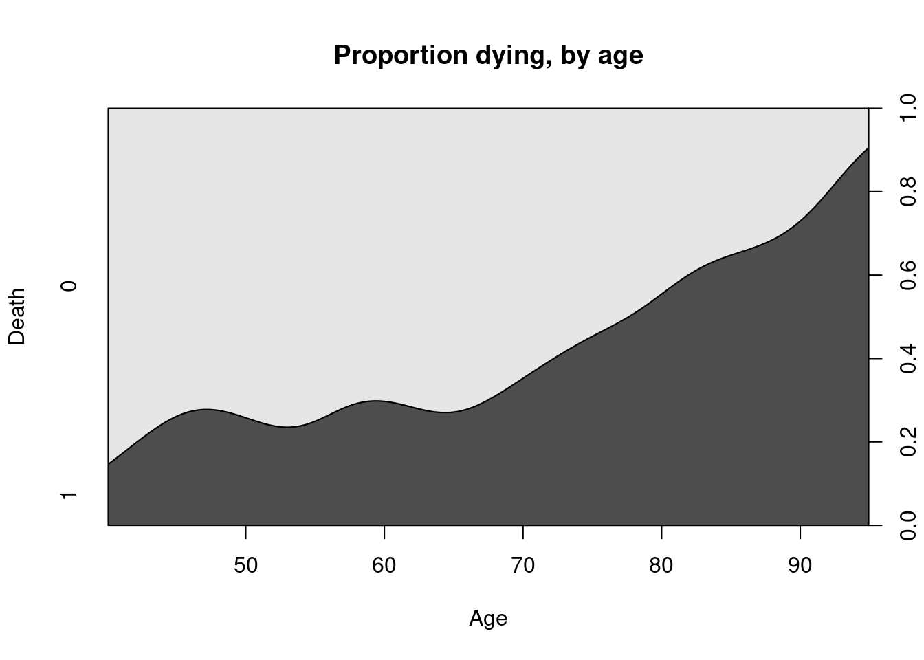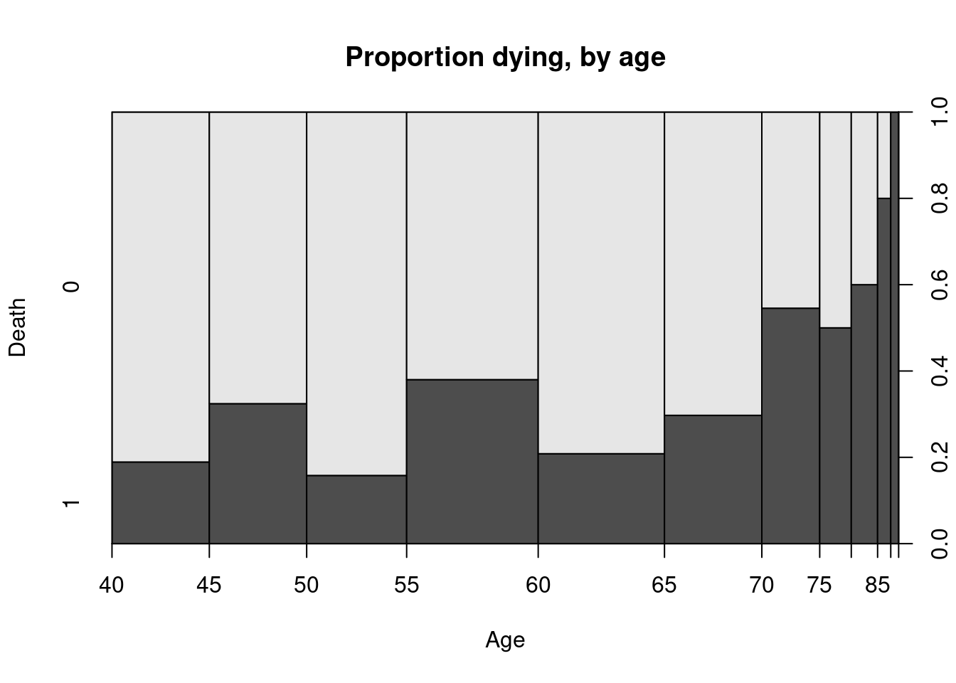 The dataset at UCI repository contains records on 299 patients who had heart failure. The data was collected during the follow-up period; each patient had 13 clinical features recorded. The primary variable of interest was whether they died or not. Suppose we wished to plot how this varied with age (a quantitative variable):