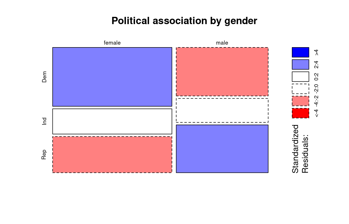 Unlike a bar chart, a mosaic plot reflects the count in each cell (through the area), along with the proportions of interest. Let us inspect how we can make mosaic plots for the political association data earlier.